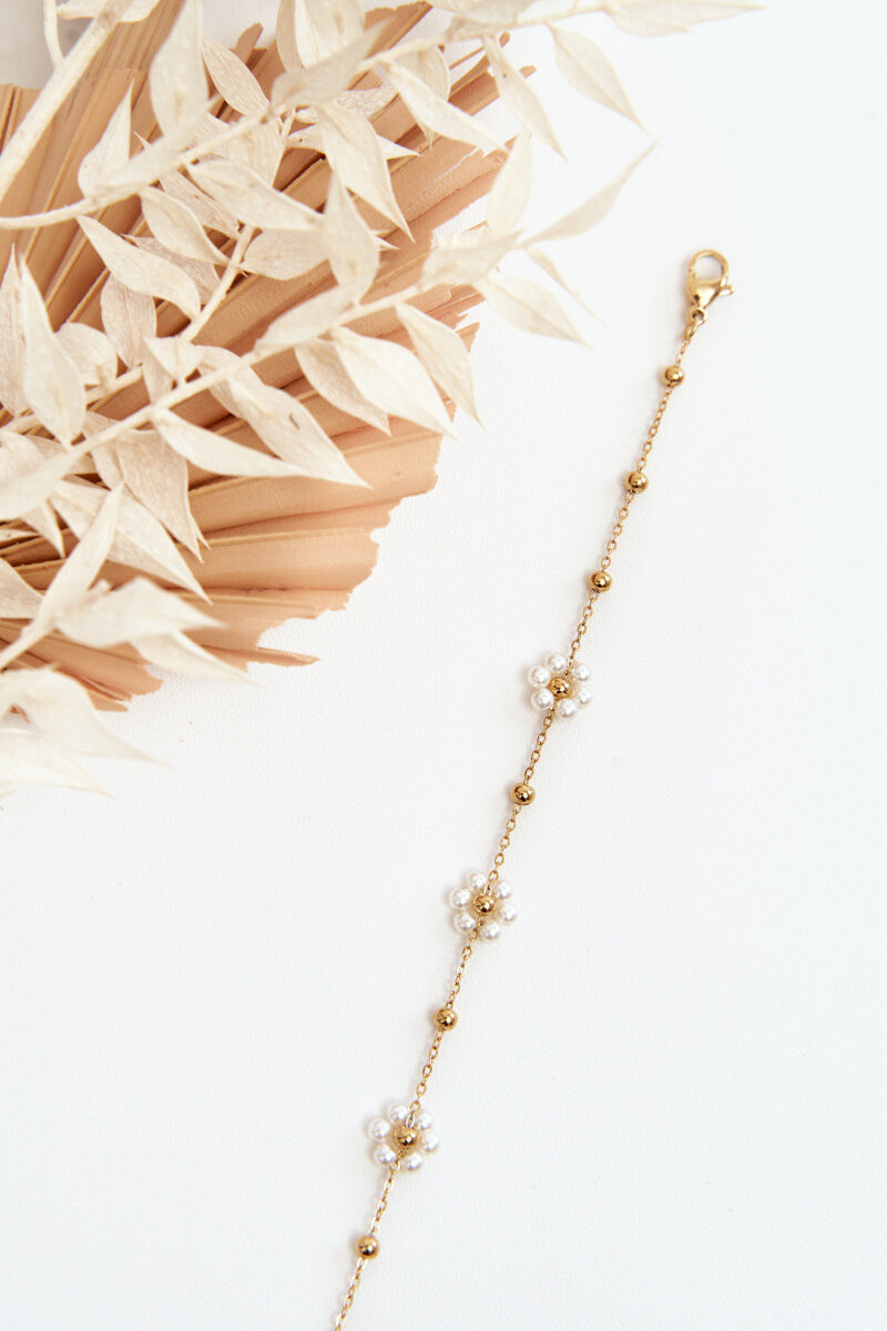 Bagātīga rokassprādze ar baltajiem ziediem zeltainā krāsā