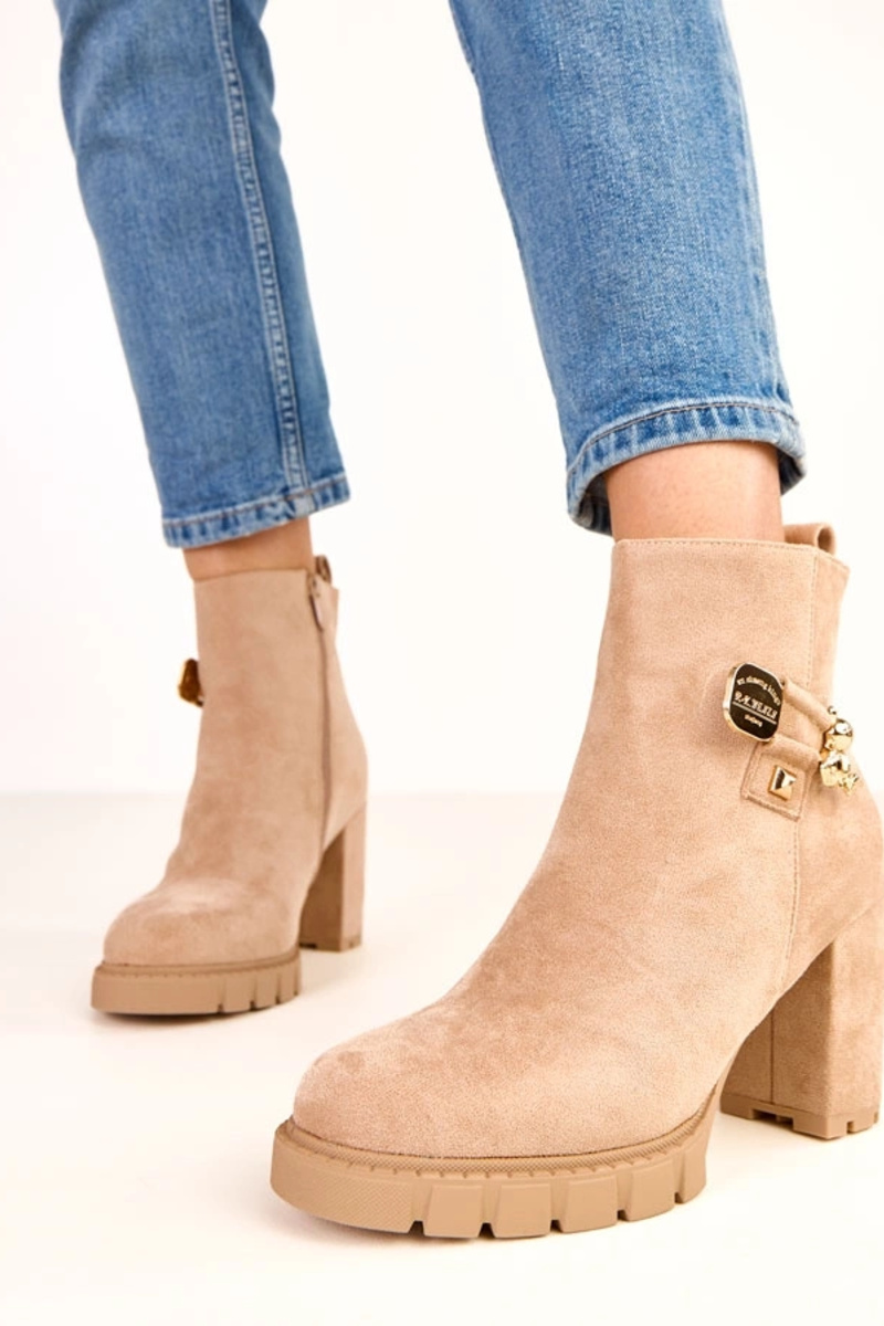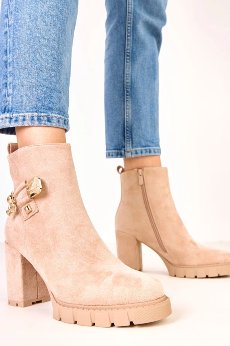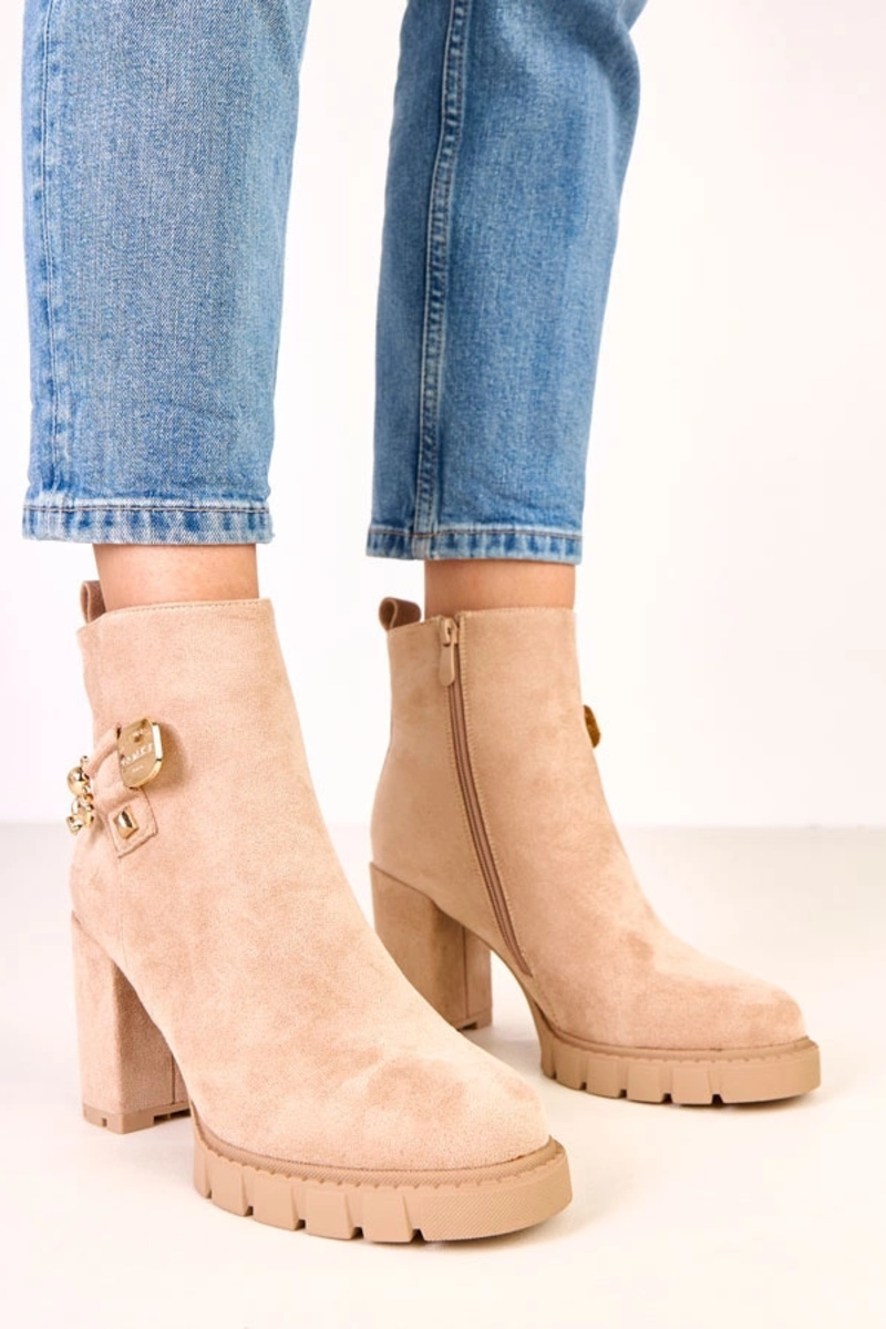 Smilšu krāsas zābaciņas uz papēža ar zelta krāsas lāča rotājumu Naste