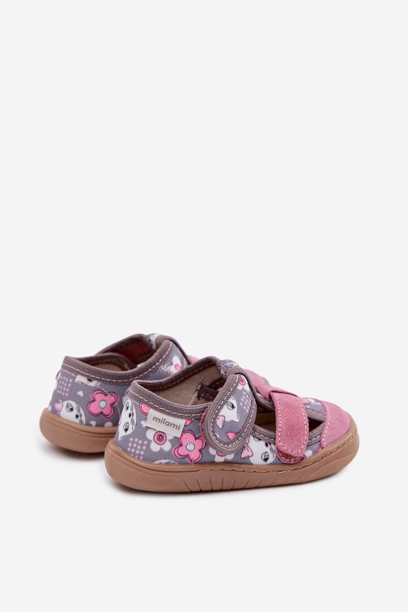 Milami pelēki-rozā bērnu basu čības ar kaķīšiem un ziediem Lumi
