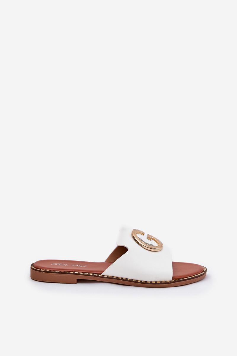 Mākslīgās ādas plakanie sieviešu čības ar rotājumiem baltā krāsā Frelie