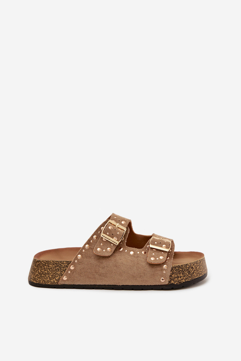 Sieviešu haki krāsas čības ar zelta krāsas sprādzēm un naglām Tervina