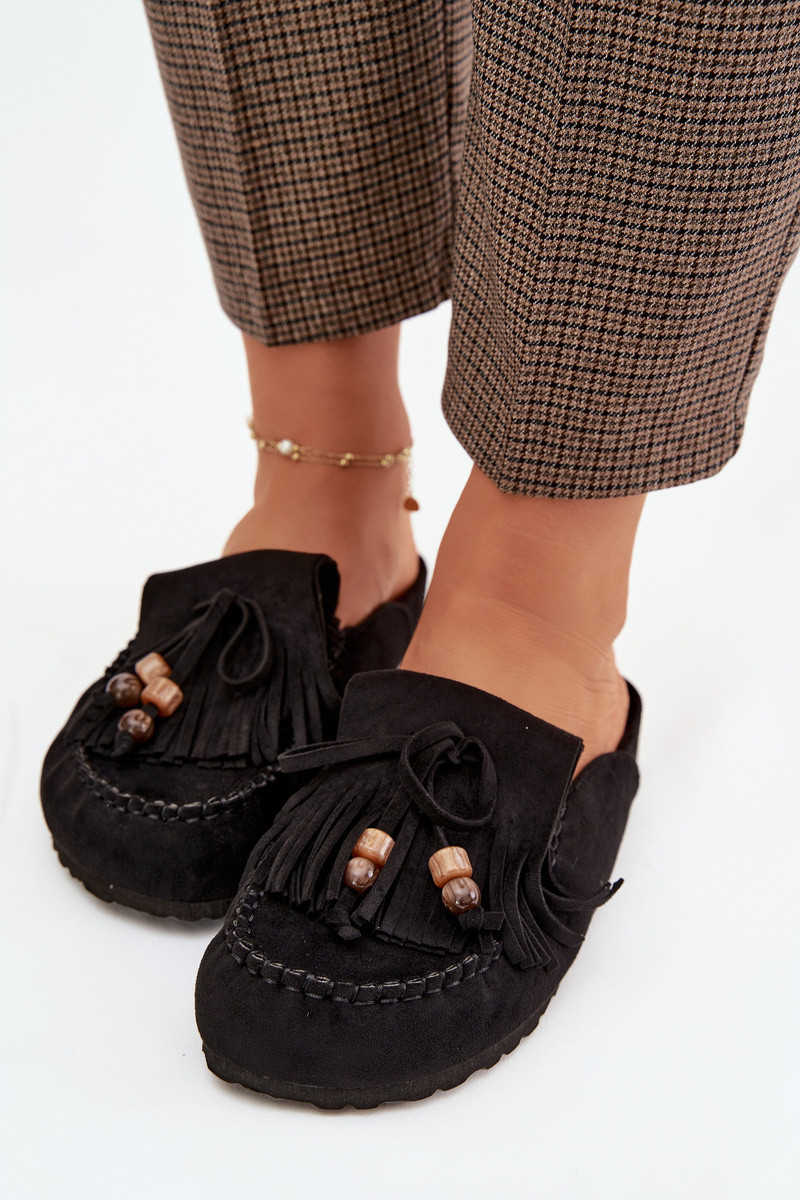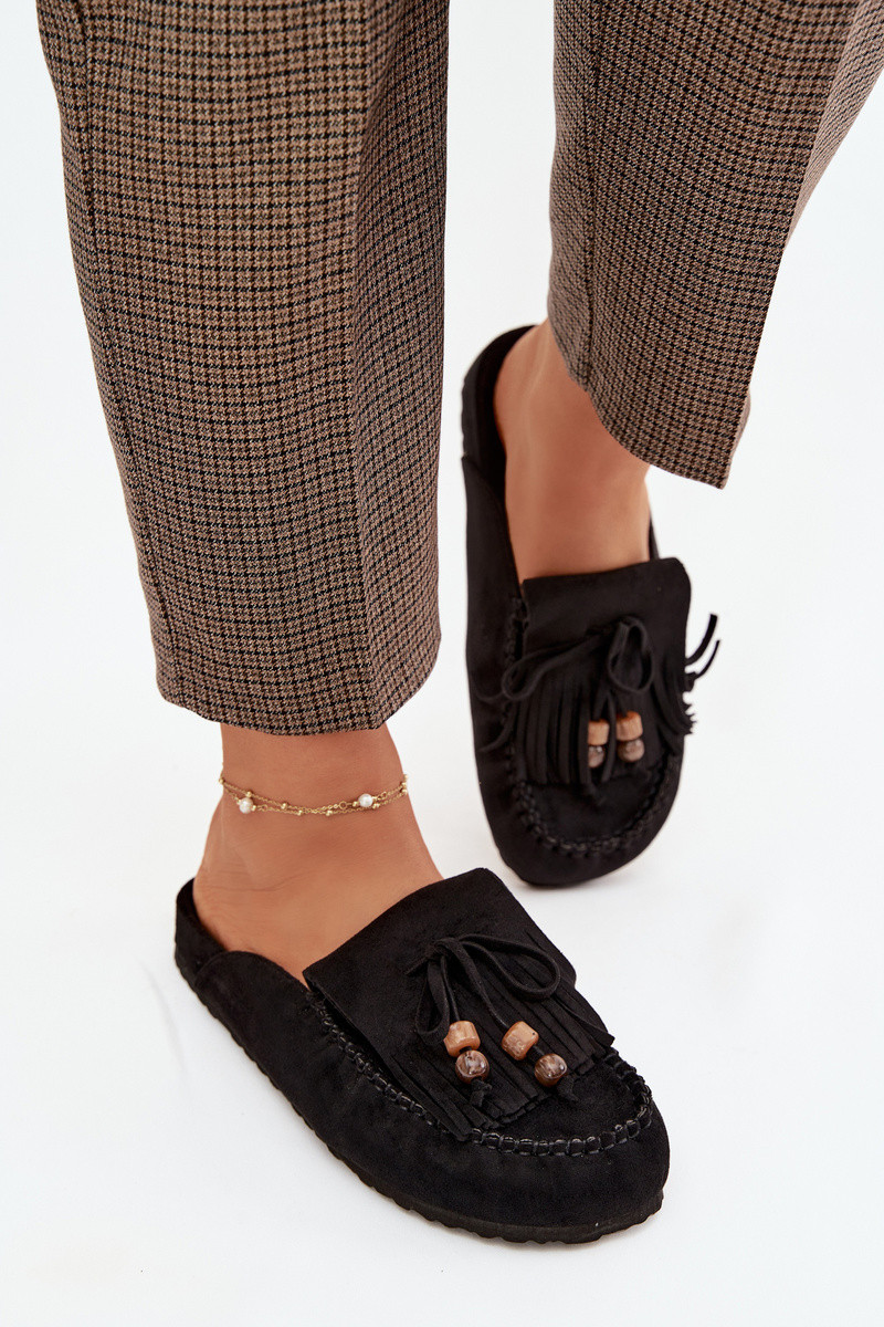 Sieviešu Mule čības ar pūciņām korallā un melnā krāsā