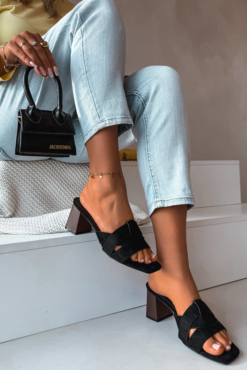 Sieviešu čības ar papēžiem un siksniņām no mākslīgā zamša, melnā krāsā, Corivelle