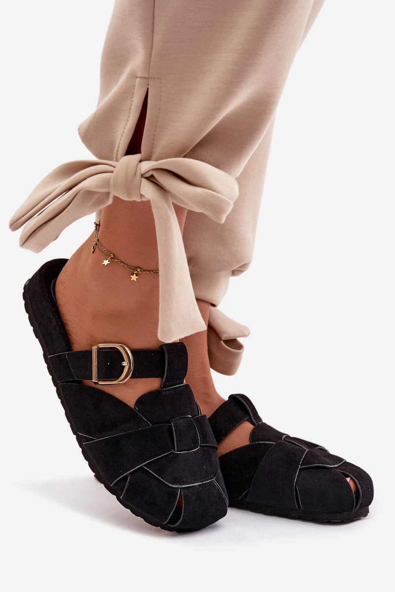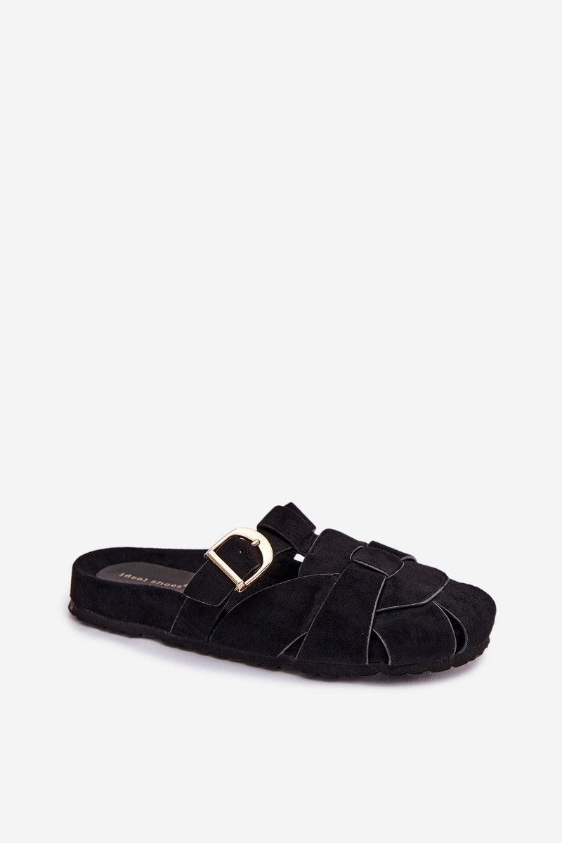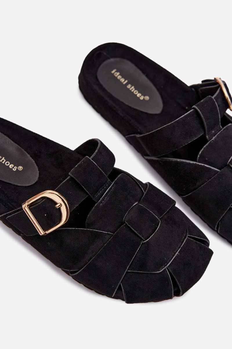 Moteriskas šlepetes Mule ar joselēm un zelta sprādzēm melnas krāsā Ganelle