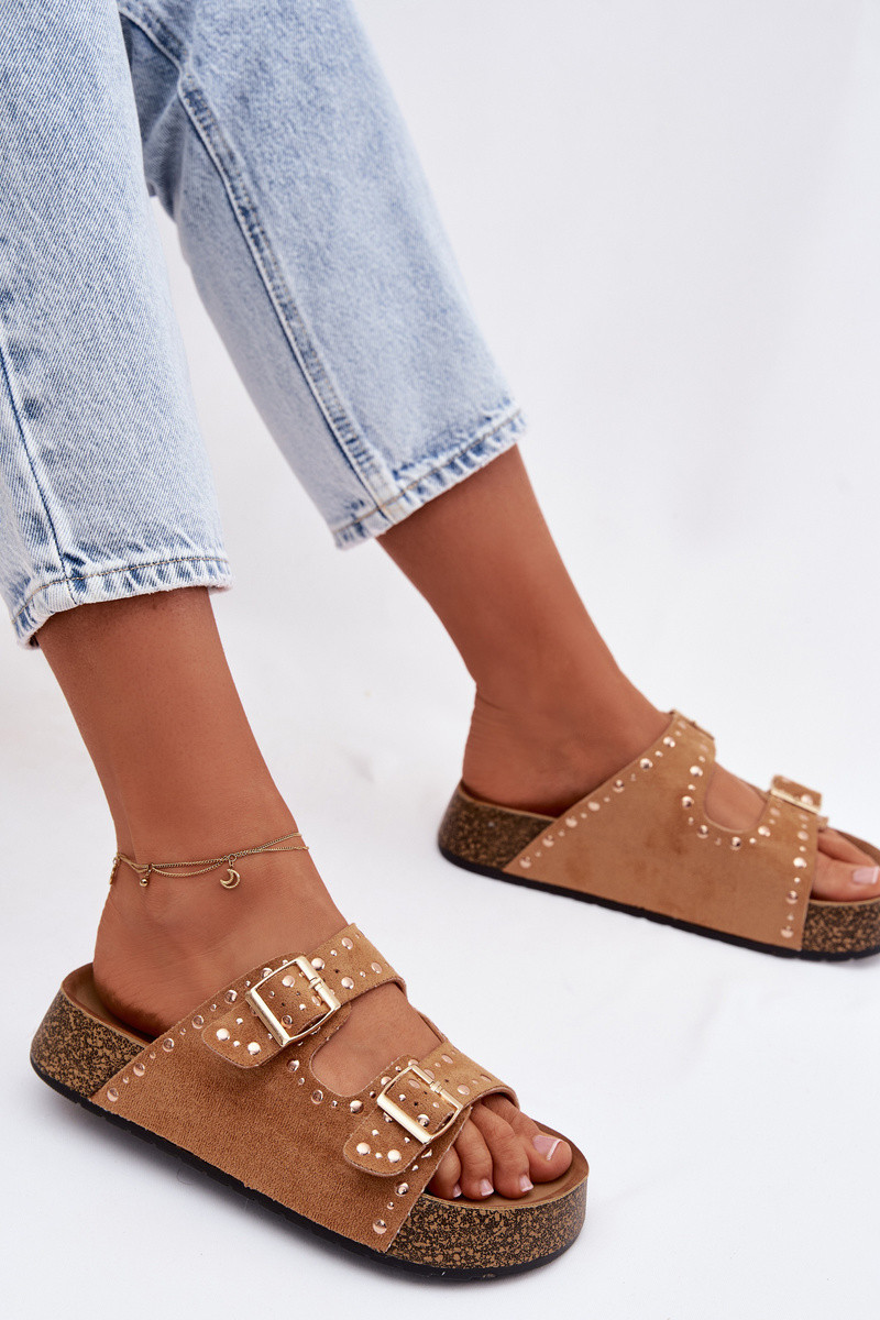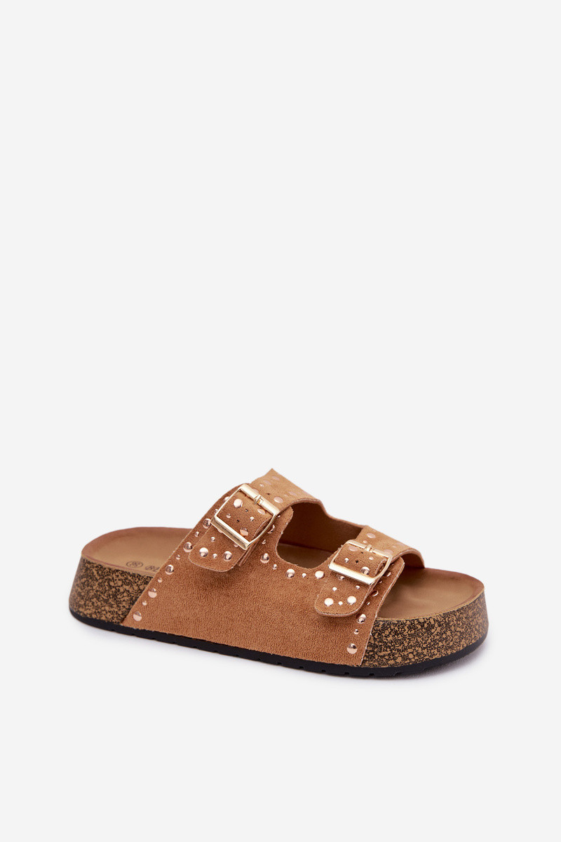 Sieviešu čības zelta krāsā ar sprādzēm un naglām brūnas krāsas Tervina