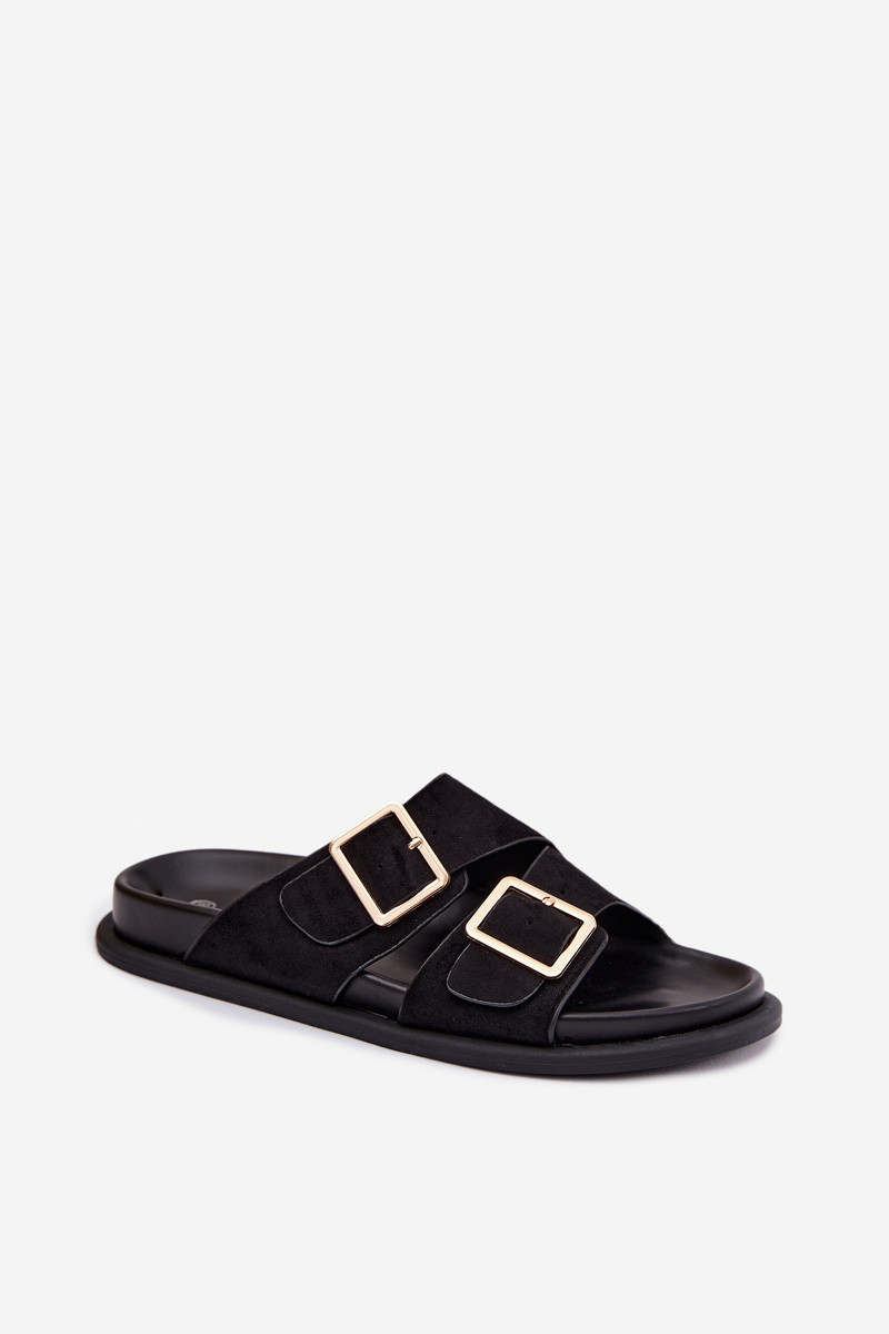 Moteriskas šokolādes krāsas čības no mākslīgā zamša ar zelta krāsas sprādzēm Selissea