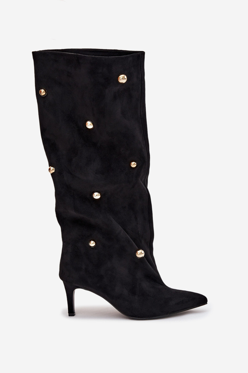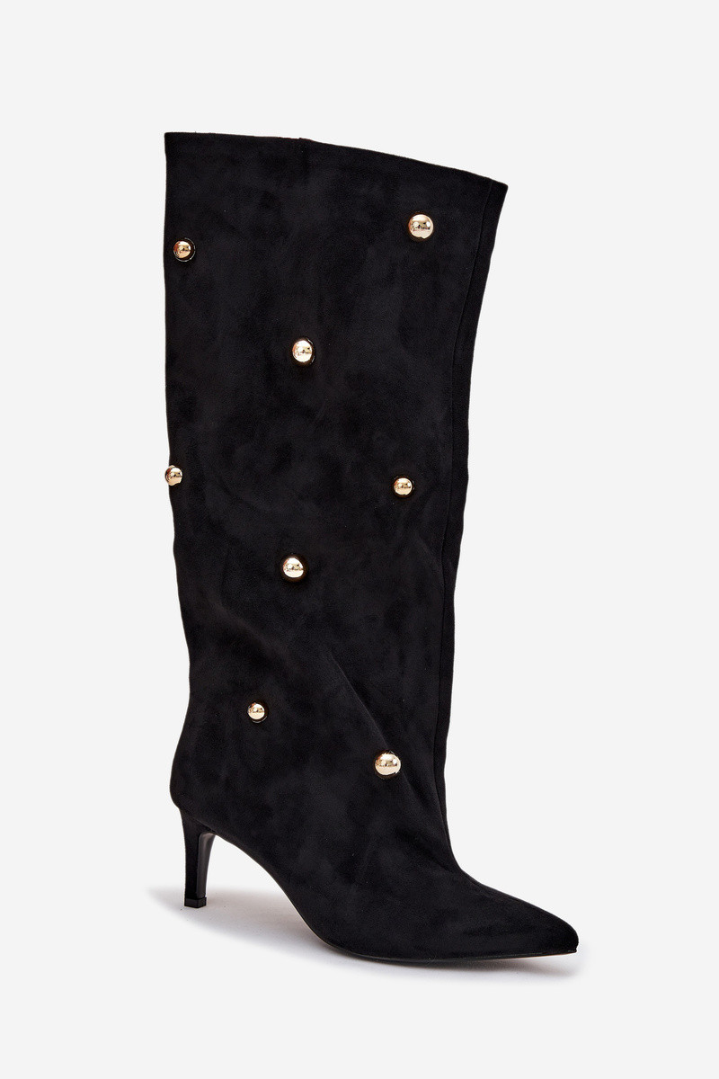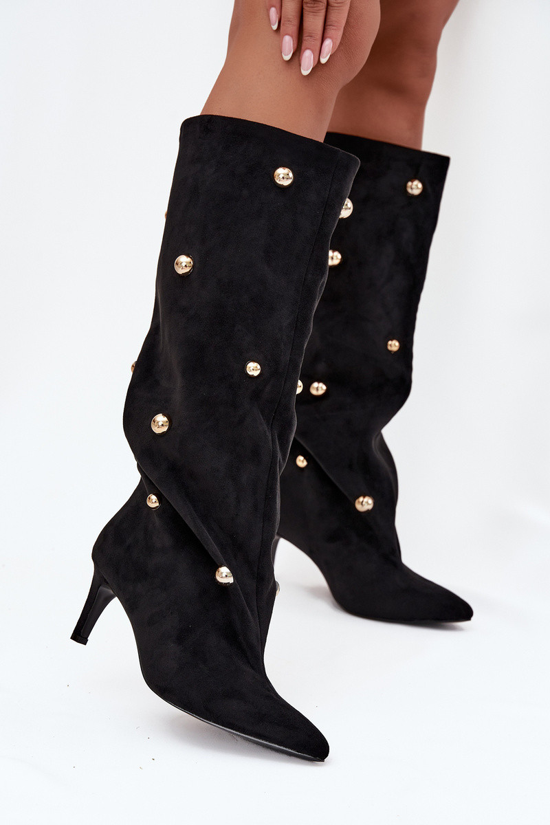 Ieslīpējamā modeļa sieviešu garie zābaki ar plāniem papēžiem un zelta krāsas rotājumiem, melnā krāsā „Thaliane"