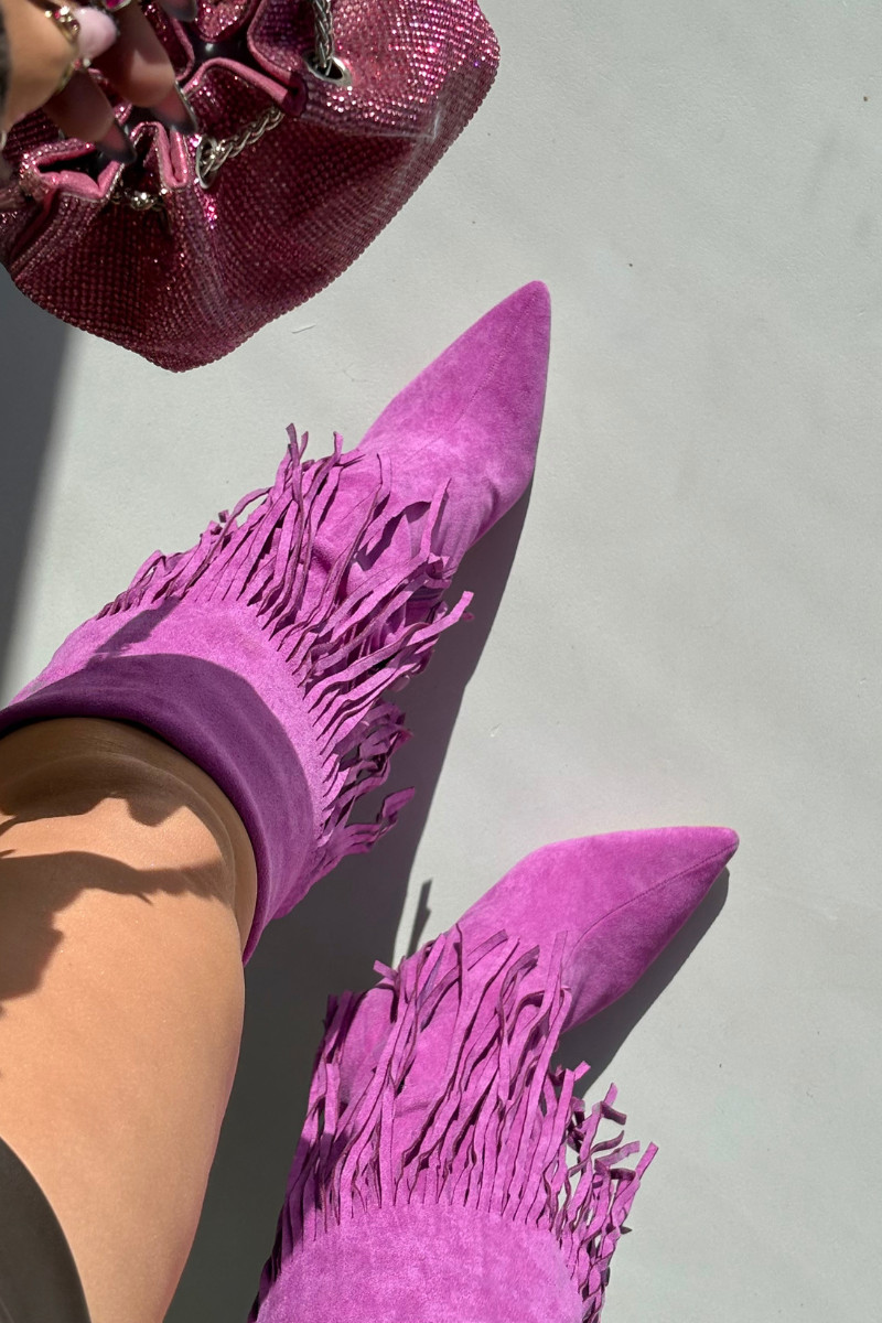 Sieviešu garie zābaki ar plāniem papēžiem un pūkām violetā krāsā Isalune