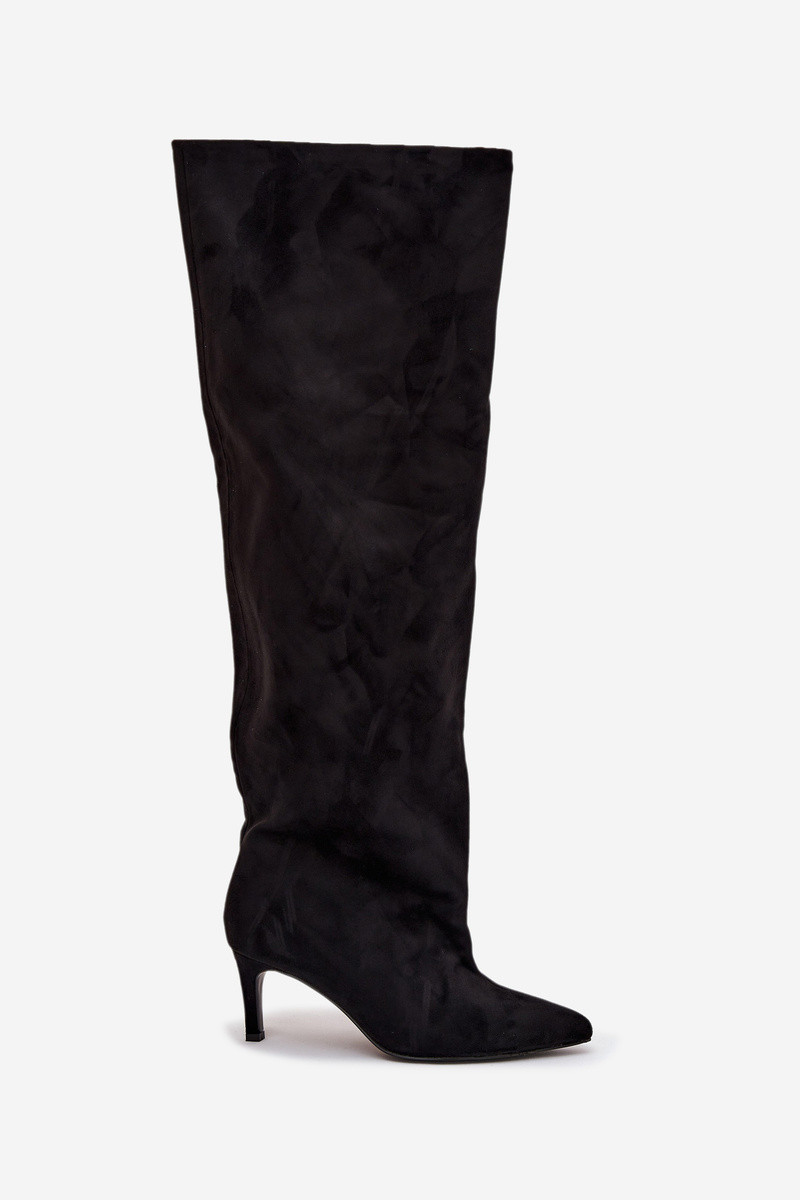 Sieviešu garās zābaki ar plāniem papēžiem, ieliekamu modeli, melnā krāsā Tai turivilla