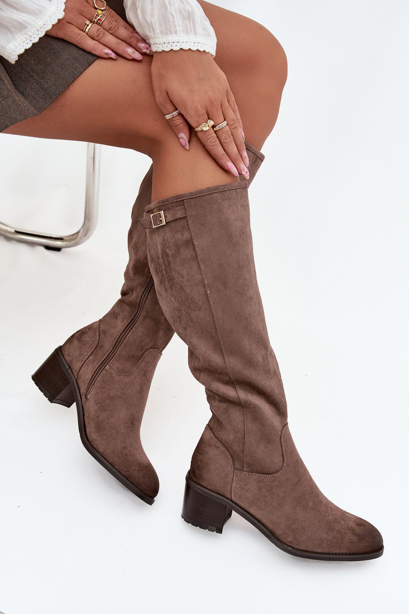 Siltie sieviešu ilgaaulie zābaki ar papēžiem un zelta krāsas sprādzēm Vinceza 58589 smilšu krāsā