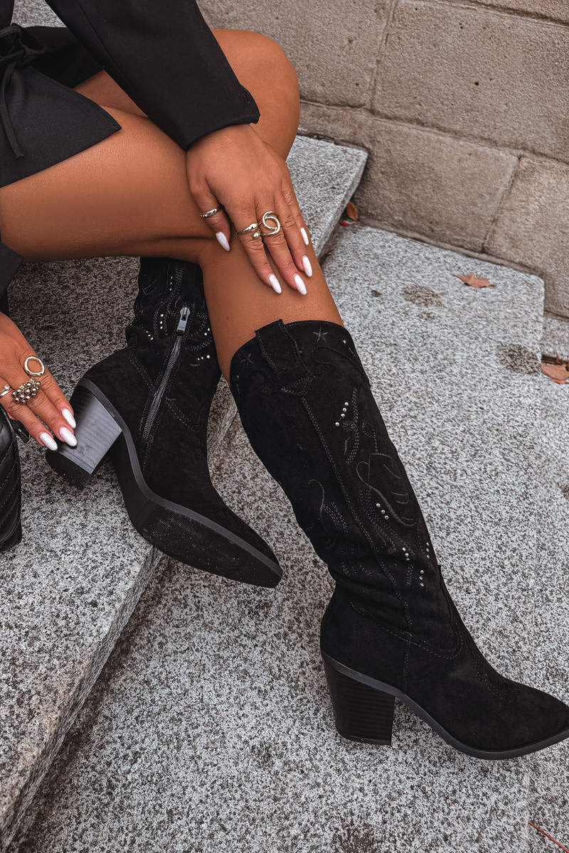 Sieviešu cowboy stila gari zābaki ar papēžiem no mākslīgā zamša melnā krāsā Coretta