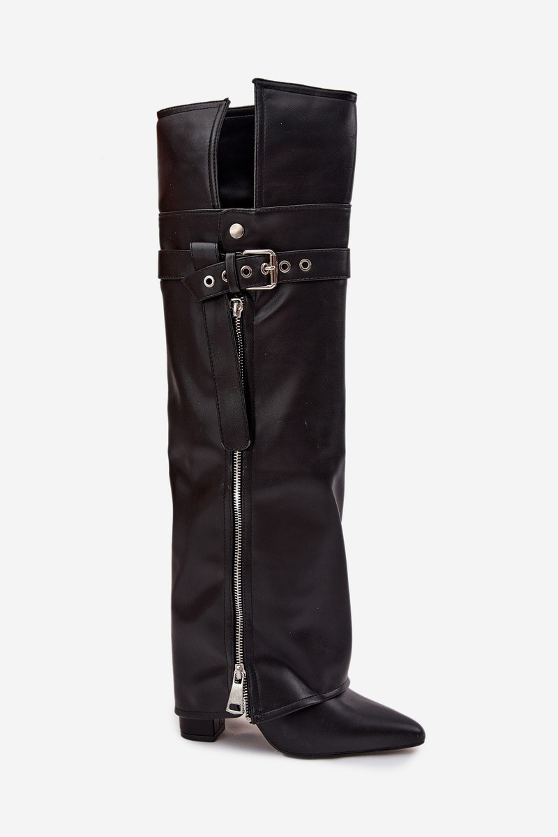 Siltināti sieviešu garie zābaki virs ceļgala ar papēžiem, siksniņām, sprādzēm un sudraba krāsas rāvējslēdzēju, melnā krāsā