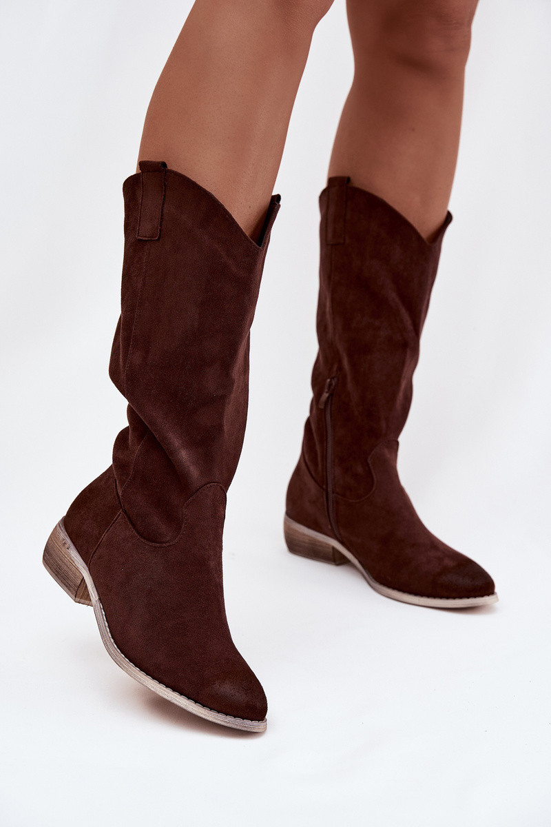 Šokolādes krāsas cowboy stila garie zābaki uz zema papēža no mākslīgā zamša Cherrie