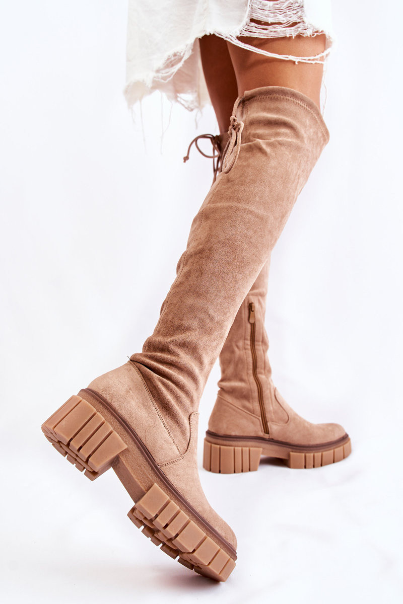 Sieviešu dabīgas zamšādas garie zābaki virs ceļgaliem smilšu krāsā Cheera