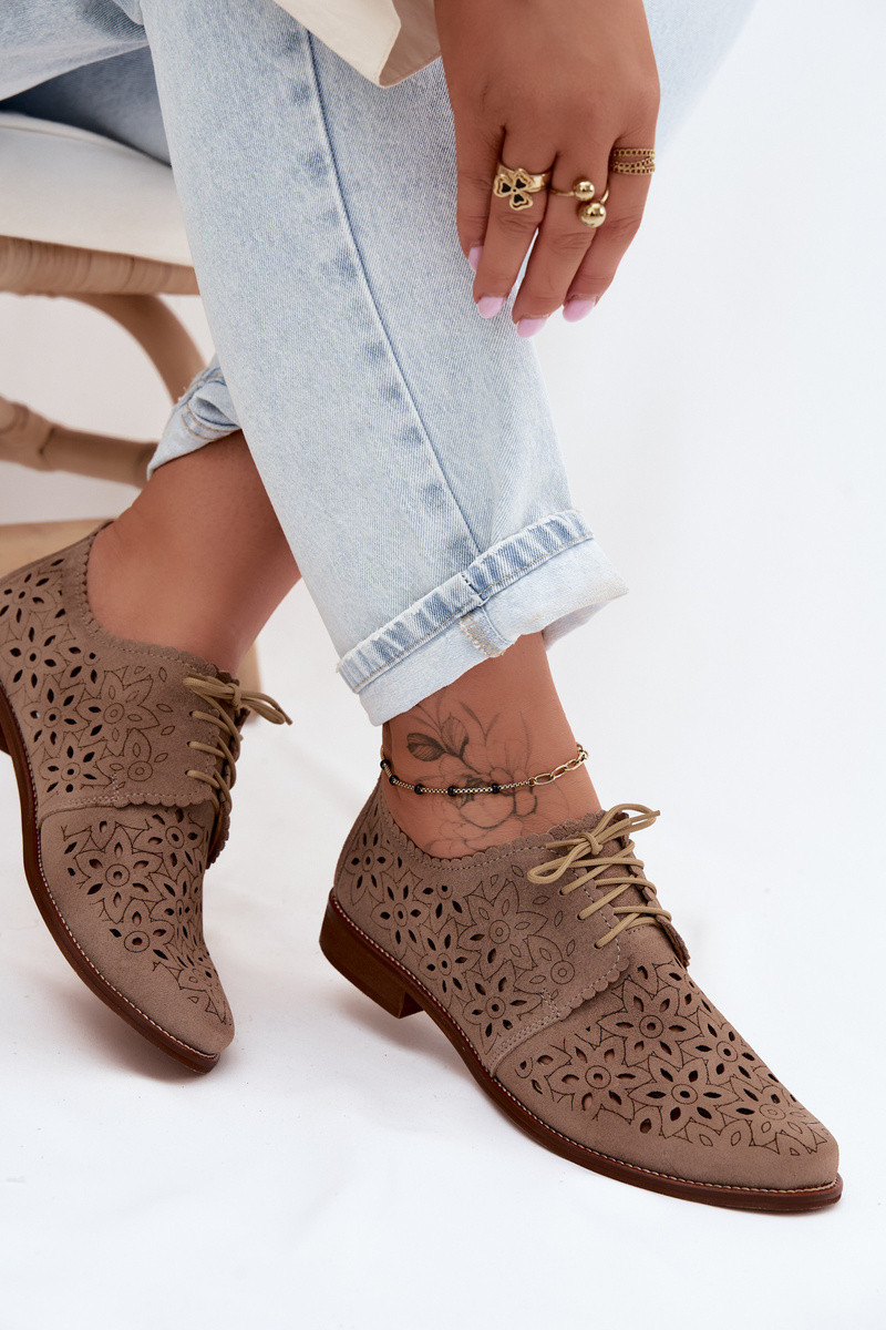 Ādas apavi ar mežģīņu elementiem un platām papēžiem zelta krāsā