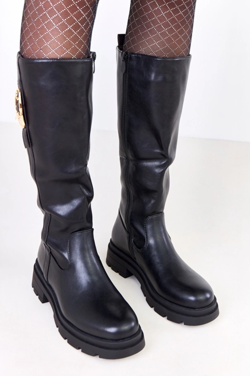 Melni mākslīgās ādas gari zābaki ar zelta rotājumu Meliros