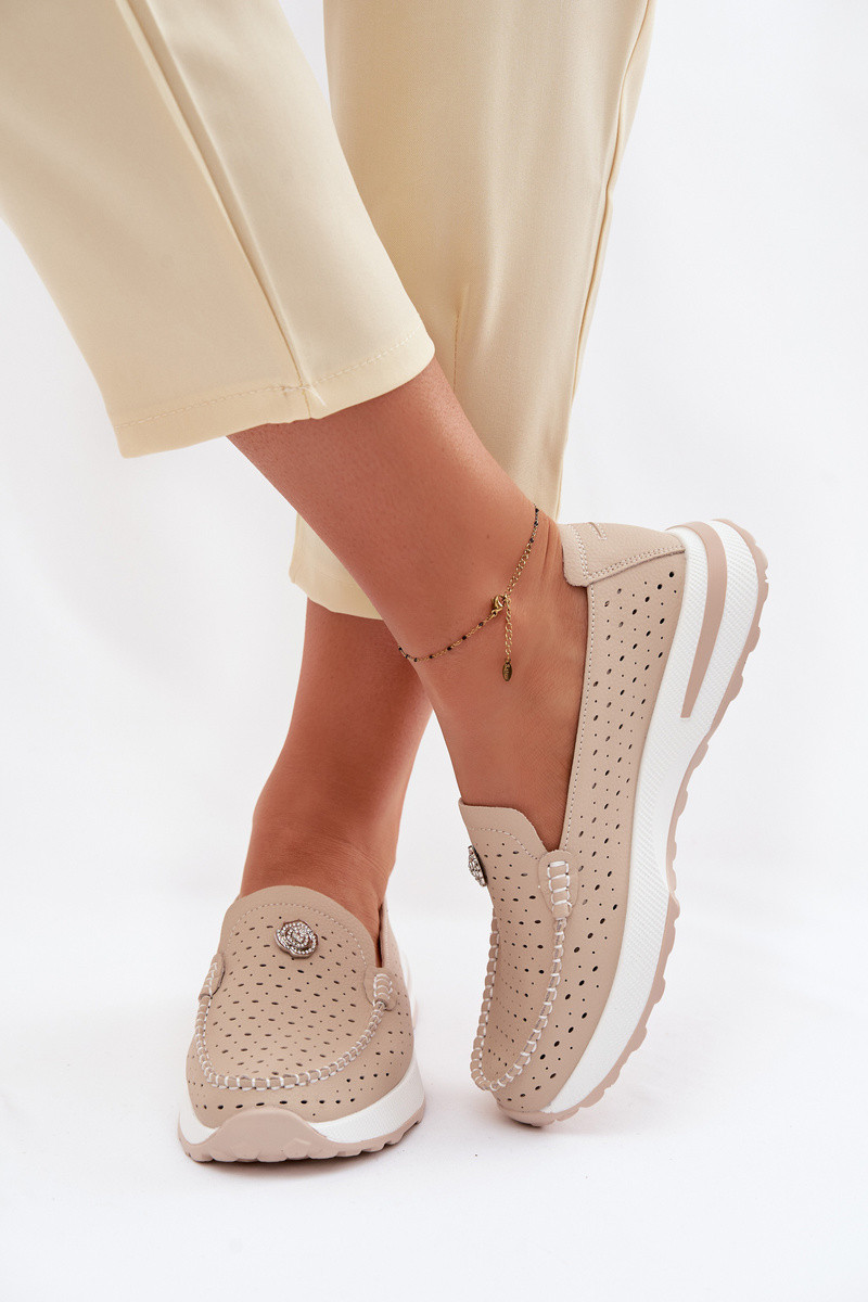 Sieviešu caurspīdīgi ādas mokasīni Kemela smilšu krāsā