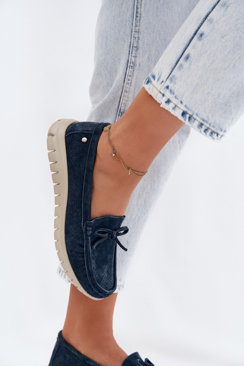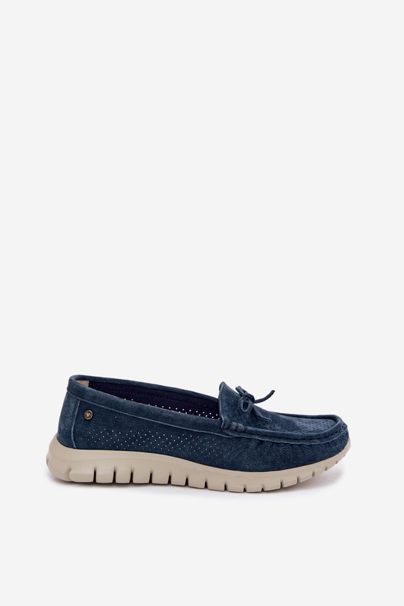 sieviešu mokasīniIeslēgtsturalnego zamšādasu ar bantītēm Vinceza 95401 tumši zilas krāsas
