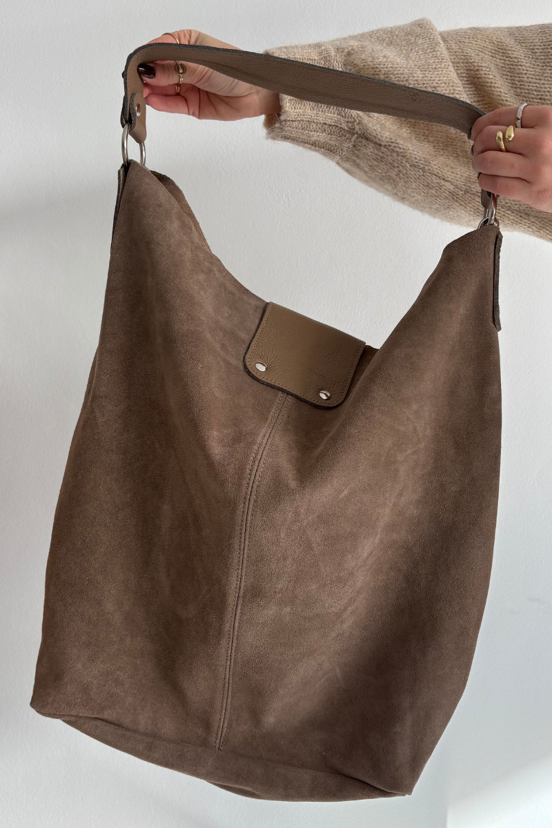 Liela tumši smilšu krāsas mākslīgās zamšas soma Hanelle