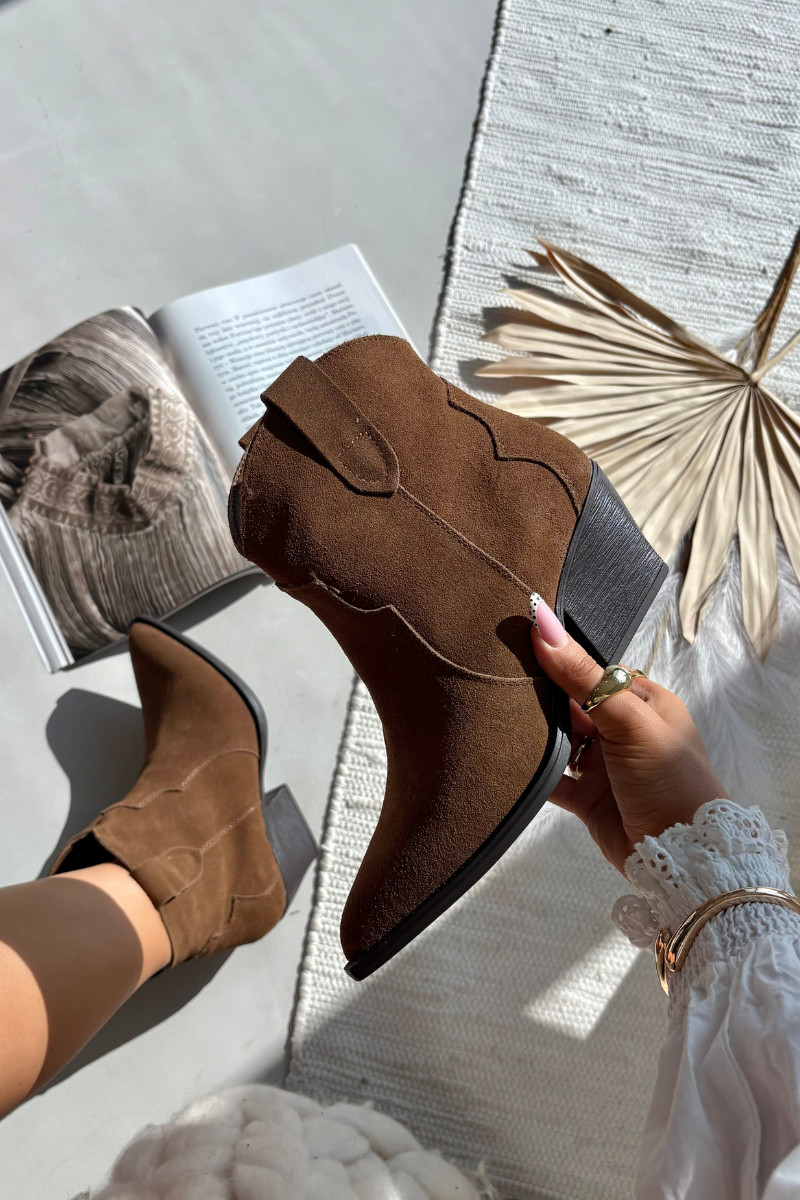 Ievilktie cowboy stila sieviešu zābaciņi no dabīgā zamša Beretta brūnā krāsā
