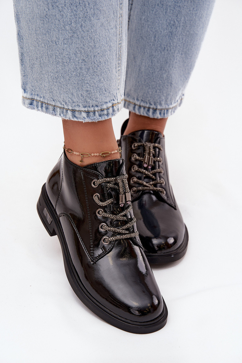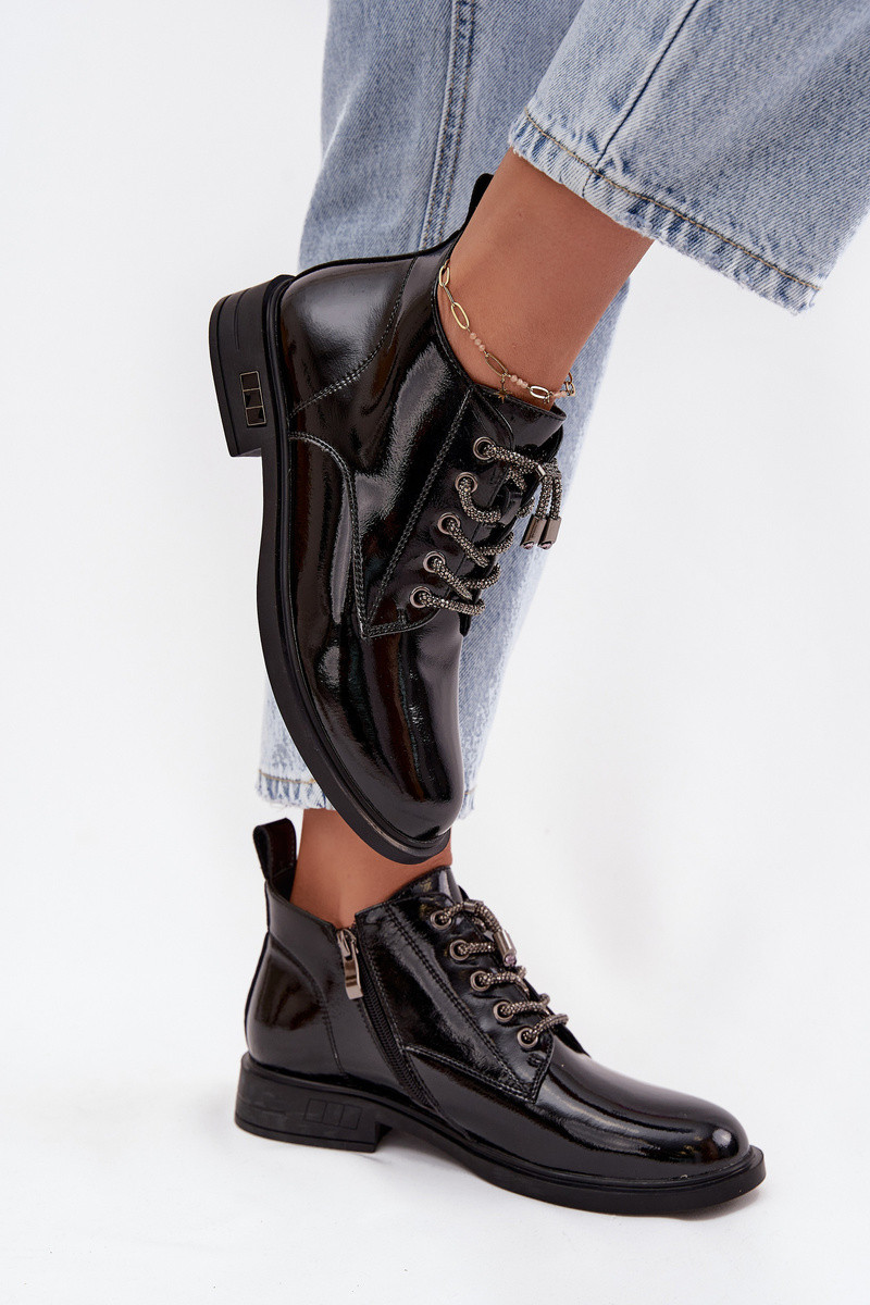 Mākslīgās ādas sieviešu zābaki ar lakota efekta ar grezniem šuvumiem D&A MR52-124 melnā krāsā