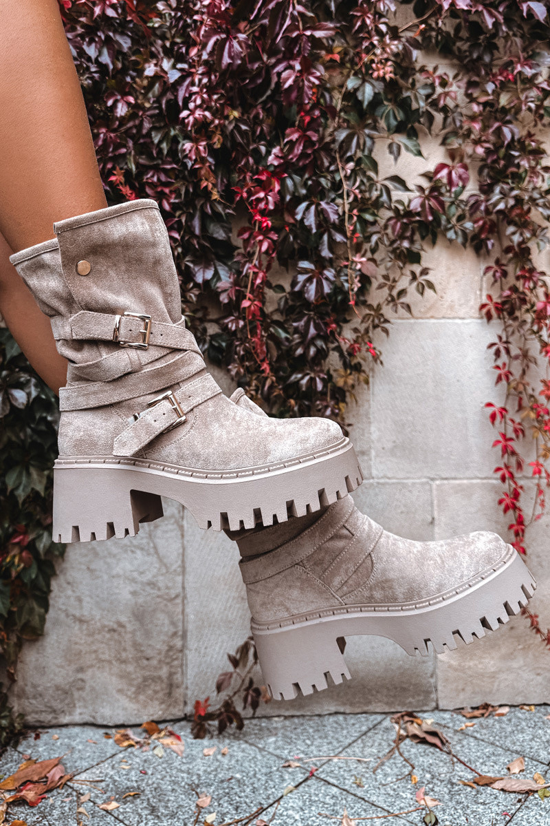 Sieviešu zābaki uz masīviem papēžiem ar sprādzēm un jostām smilšu krāsā Nerelisa