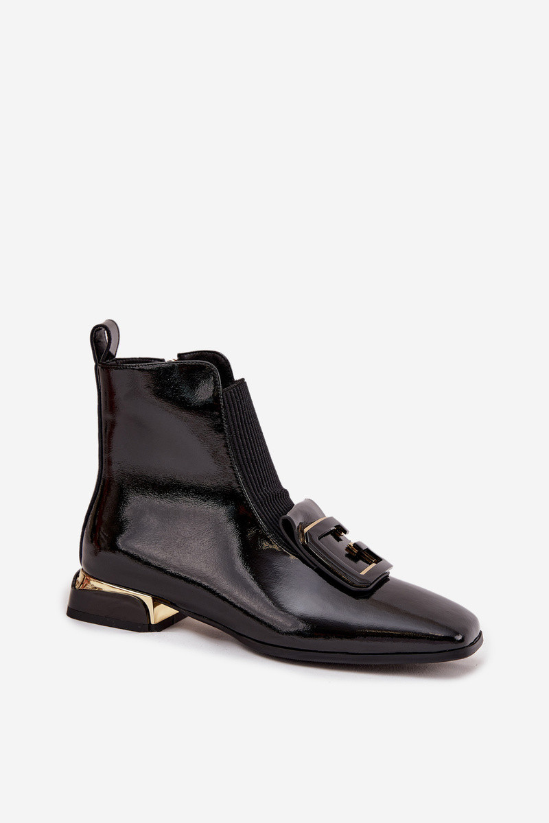 Mākslīgās lakotas ādas sieviešu zābaciņi uz zema papēža ar ornamentiem, D&A MR52-216, melnā krāsā